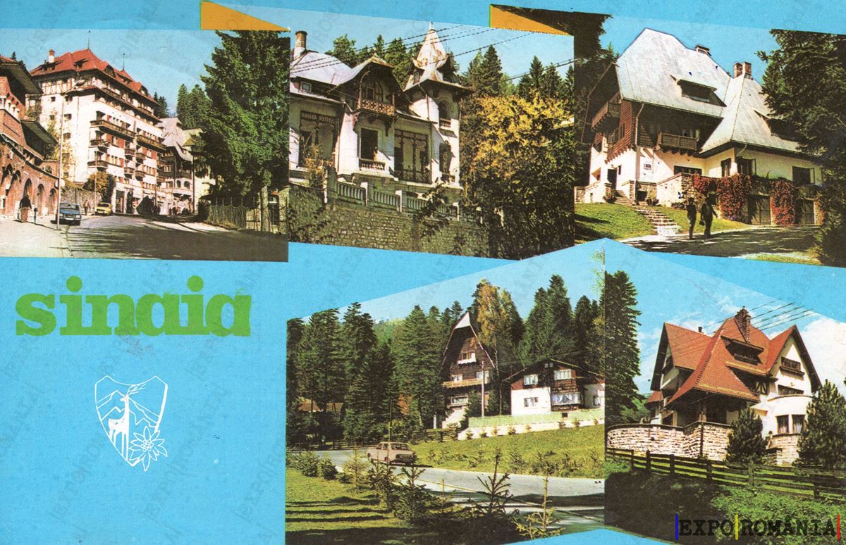 Imaginea reprezintă o carte poștală dedicată orașului Sinaia, România. Pe fundalul albastru se află numele „Sinaia” scris cu litere mari, de culoare verde. În colaje sunt prezentate diverse clădiri și peisaje caracteristice ale zonei, incluzând vile cu arhitectură specifică, înconjurate de copaci și vegetație luxuriantă. Unele imagini surprind străzi pitorești și zone de relaxare, evidențiind frumusețea naturală și arhitecturală a localității. Detaliile din fiecare fotografie reflectă atmosfera montană și turistică a Sinaiei.