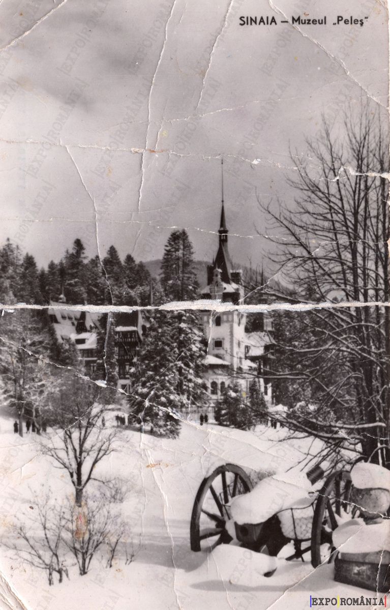 Imaginea reprezintă o carte poștală veche din Sinaia, evidențiind Muzeul Peleș, un exemplu remarcabil de arhitectură neo-renascentistă. Peisajul este acoperit de zăpadă, creând o atmosferă de iarnă idilică. În prim-plan, se observă o căruță veche, parțial îngropată în zăpadă, iar în fundal se află clădirea muzeului, cu turnul său distinctiv și feronerie elaborată. Împrejurimile sunt dominate de copaci acoperiți de nea, contribuind la peisajul montan specific zonei. Cerul este senin, iar lumina reflectată de zăpadă adaugă un farmec aparte imaginii. Textul din partea de sus indică locația și numele muzeului.