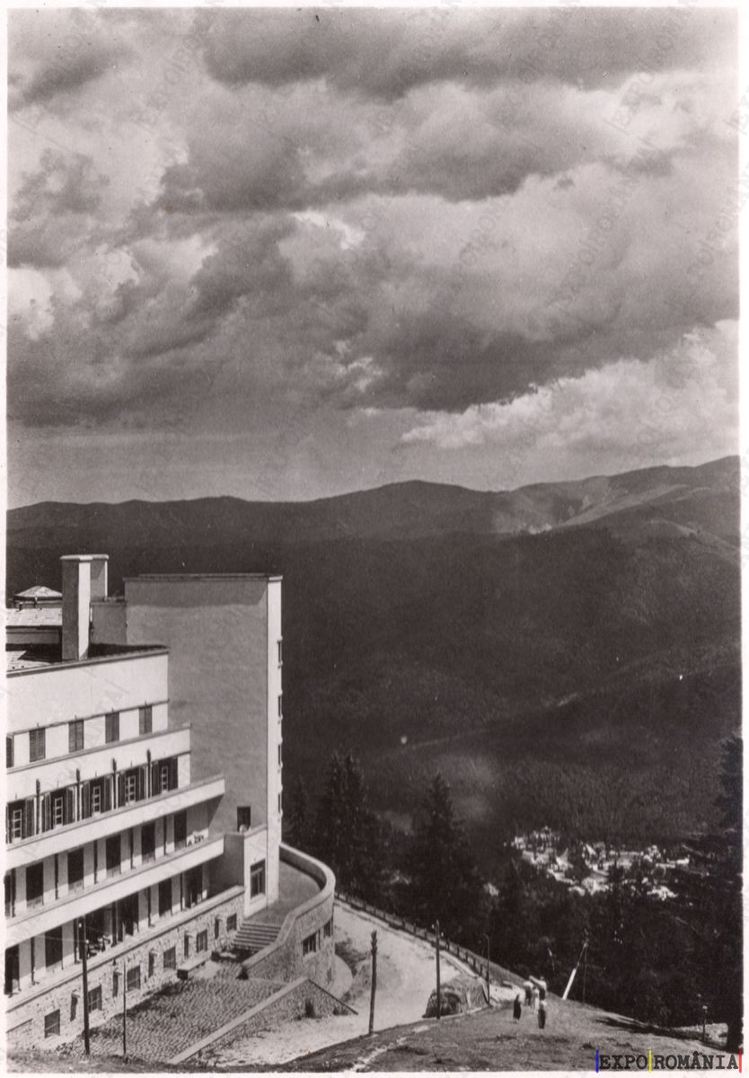 Imaginea prezintă un peisaj montan, surprins într-o nuanță de alb și negru, care evocă o atmosferă nostalgic. În prim-plan se află un edificiu modern, cu linii arhitecturale clare, ce pare să fie situat pe o panta abruptă. Clădirea are feronerie și balcoane, iar drumul curbat care se desfășoară în fața ei sugerează accesibilitatea zonei.