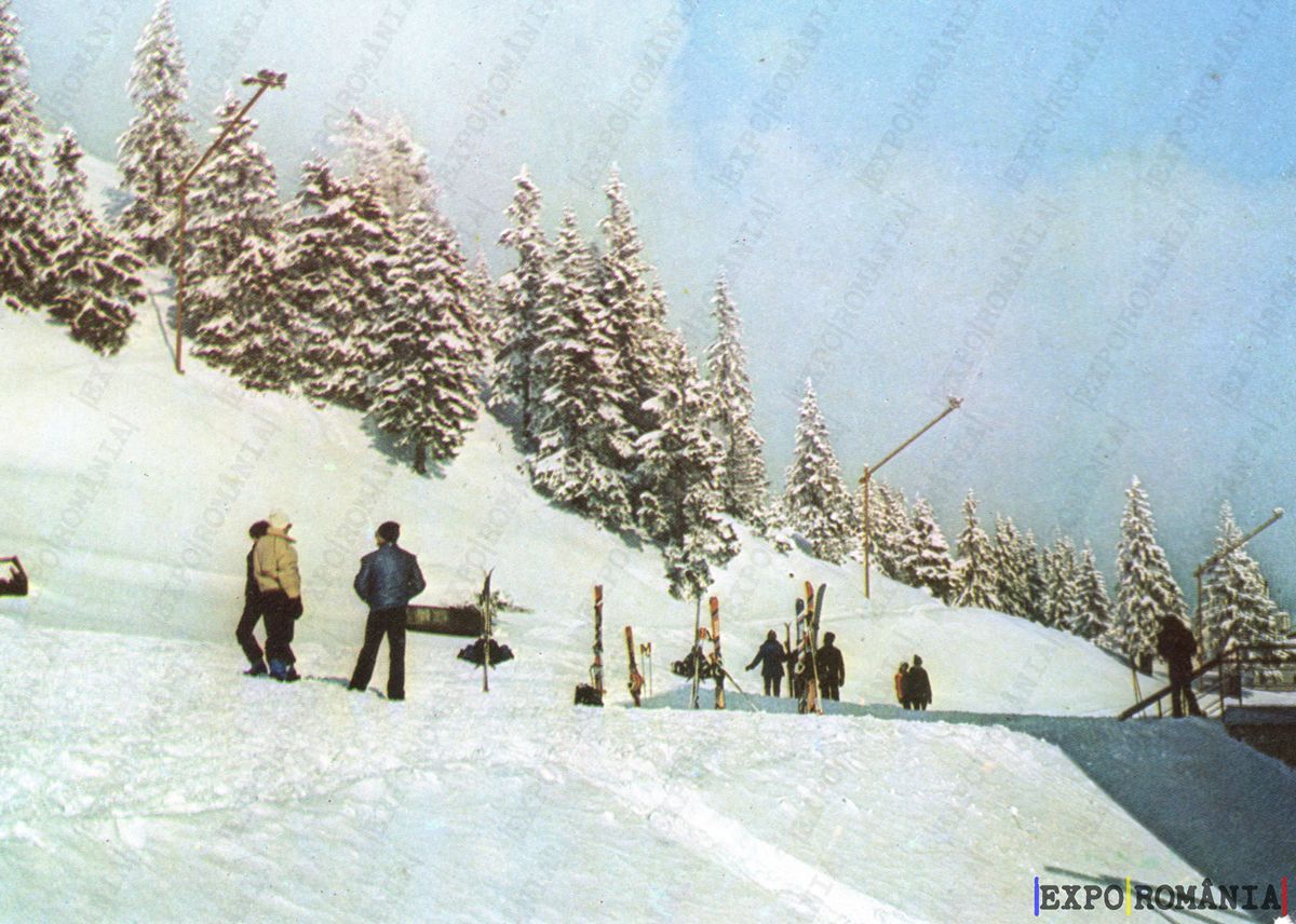 Imaginea prezintă un peisaj montan acoperit de zăpadă, cu copaci înalți și verzi, îmbrăcați în mantia albă a iernii. Pe pârtiile de schi, se pot observa mai multe persoane, unele pregătindu-se să schieze, iar altele plimbându-se. Atmosfera este una de bucurie și activitate, cu cerul parțial acoperit de nori. În fundal, se disting echipamentele de schi și semnele de direcție, sugerând o zonă populară pentru sporturile de iarnă. Peisajul evocă o zi tipică de iarnă, plină de distracție și aventură în natură.