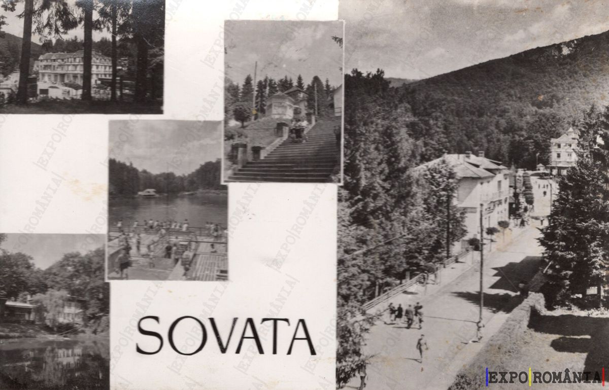 Imaginea reprezintă o carte poștală dedicată stațiunii Sovata, cu un design care include mai multe fotografii. În colțurile superioare se află imagini cu clădiri și peisaje naturale, evidențiind frumusețea zonei. O fotografie centrală ilustrează un lac, sugerând activități recreative. Pe partea inferioară a cărții poștale, se observă o stradă cu oameni care se plimbă, înconjurată de copaci și clădiri caracteristice. Textul „SOVATA” este plasat proeminent, subliniind destinația turistică. Atmosfera generală evocă liniște și relaxare în mijlocul naturii.