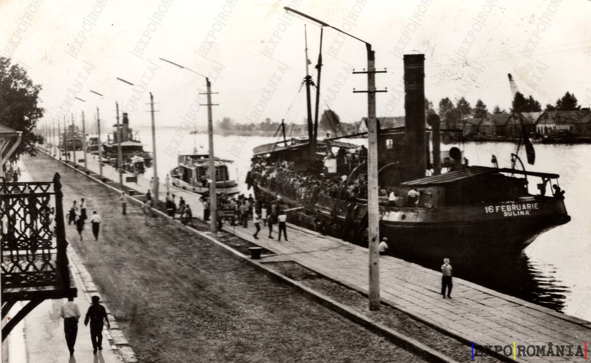 Imaginea reprezintă o scenă din București, probabil pe malul unui râu sau canal. Se observă mai multe ambarcațiuni ancorate, dintre care una este un vapor cu numele „16 Februarie”. Pe mal, oamenii se află în mișcare, unii îndreptându-se spre vapor, iar alții plimbându-se pe trotuar. Peisajul este marcat de stâlpi de iluminat și de o atmosferă de epocă, sugerând o perioadă istorică anterioară. În fundal, se pot observa clădiri și vegetație, completând imaginea urbană a capitalei.