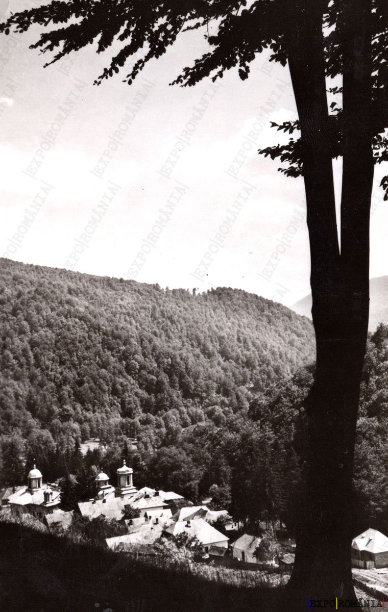Imaginea prezintă un peisaj montan, cu o vale adâncă acoperită de păduri dense. În prim-plan, se observă un copac mare, care oferă umbră și conturează silueta peisajului. În fundal, se află un sat mic, cu case tradiționale, acoperite cu țiglă, și câteva clădiri care par a fi biserici, având turle distincte. Peisajul este dominat de munți verzi, iar cerul este parțial acoperit de nori, sugerând o atmosferă liniștită și naturală. Această imagine evocă un sentiment de serenitate și frumusețe rustică.