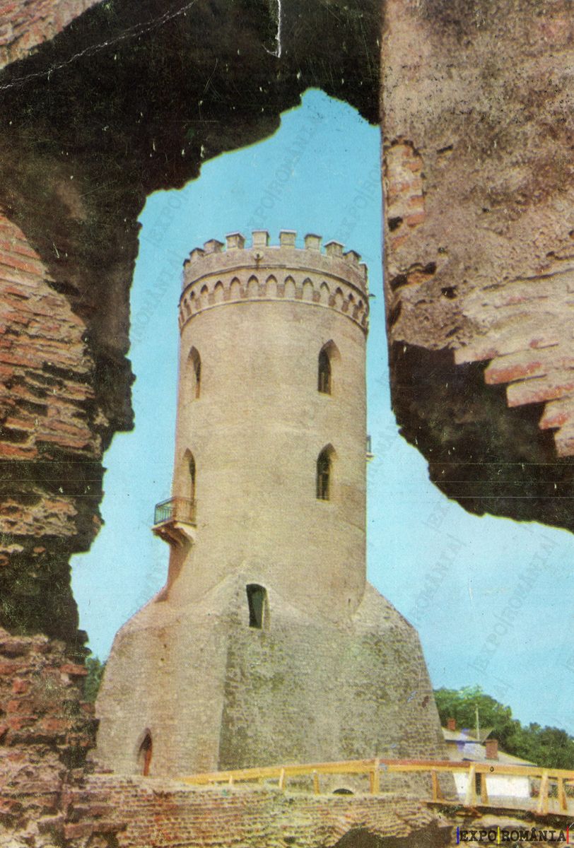 Imaginea prezintă o turn de piatră, cu un design cilindric și un acoperiș crenelat, situat într-un peisaj stâncos. Turnul este parțial înconjurat de ruine, iar în prim-plan se observă o deschidere mare în stâncă, care framează structura. Cerul este senin, cu nuanțe de albastru, iar vegetația verde din fundal completează scena. Detaliile arhitecturale ale turnului sugerează o istorie bogată și un loc de importanță culturală.