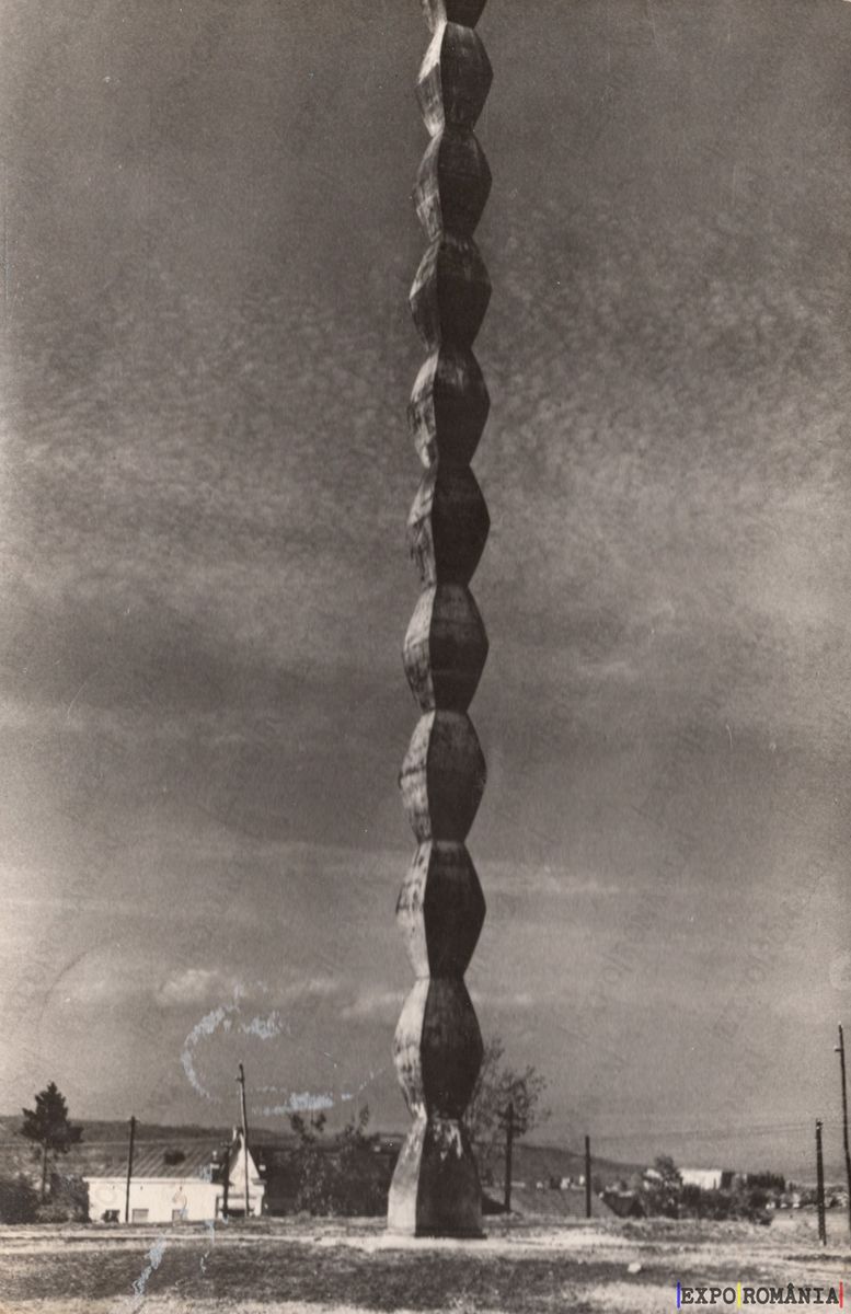 Imaginea prezintă o sculptură înaltă, cu un design spiralat, care se ridică spre cer. Sculptura este realizată dintr-un material texturat, având o formă distinctivă, cu segmente rotunjite și înguste. Fundalul este dominat de un cer cu nori, iar în partea de jos se pot observa câteva clădiri și copaci, sugerând un peisaj urban. Întreaga compoziție transmite o senzație de verticalitate și eleganță, evidențiind detaliile sculpturii într-un contrast puternic cu cerul.