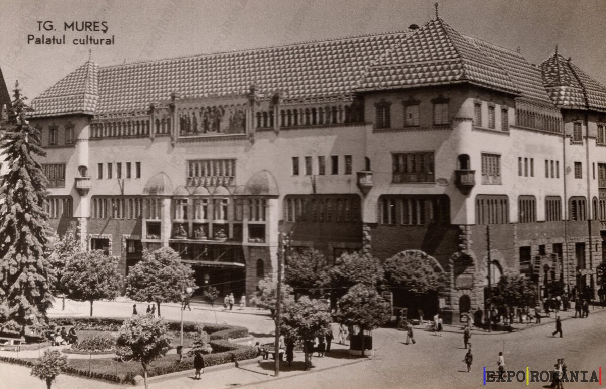 Imaginea reprezintă o carte poștală vintage a Palatului Cultural din Târgu Mureș, România. Clădirea se distinge prin arhitectura sa impresionantă, cu un acoperiș înclinat și detalii decorative elaborate. Fațada este marcată de feronerie ornamentală și feronerie la feronerie, iar feroneria de la feronerie adaugă un aer elegant. În jurul clădirii, se află un parc cu copaci și arbuști bine întreținuți, iar pe aleile din jur se pot observa oameni care se plimbă. Atmosfera este una de liniște și frumusețe arhitecturală, evocând o epocă deosebită.