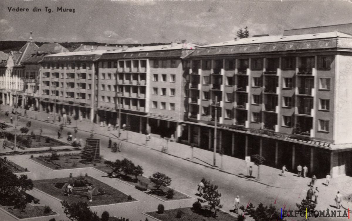 Imaginea reprezintă o carte poștală veche din Târgu Mureș, surprinzând o vedere panoramică a unei străzi principale. În prim-plan, se observă o piață amenajată cu plante decorative și statui, oferind un aspect plăcut și îngrijit. Clădirile din fundal sunt de tip modernist, cu balcoane și feronerie specifică perioadei, evidențiind arhitectura urbană a vremii. Pe trotuare, se pot vedea oameni care se plimbă, adăugând viață scenei. Cerul este parțial noros, iar atmosfera generală sugerează o zi obișnuită în oraș. Textul de sus indică locația: „Vederea din Tg. Mureș”.