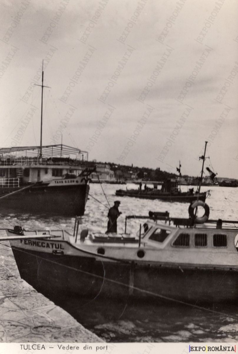 Imaginea reprezintă o vedere din portul Tulcea, surprinsă într-un stil vintage, cu nuanțe de alb și negru. În prim-plan se află o barcă mică, pe care se poate observa un marinar, îmbrăcat în uniformă, care pare să fie ocupat cu activități de navigație. În fundal, se disting alte ambarcațiuni, inclusiv o navă mai mare cu un punte superioară. Cerul este parțial acoperit de nori, iar apa reflectă lumina într-un mod calm. Pe barca din prim-plan este inscripționat numele „LARICEATUL”, evidențiind identitatea acesteia. Pe tot parcursul imaginii se simte atmosfera unei zile obișnuite în port, plină de viață și activitate maritimă.