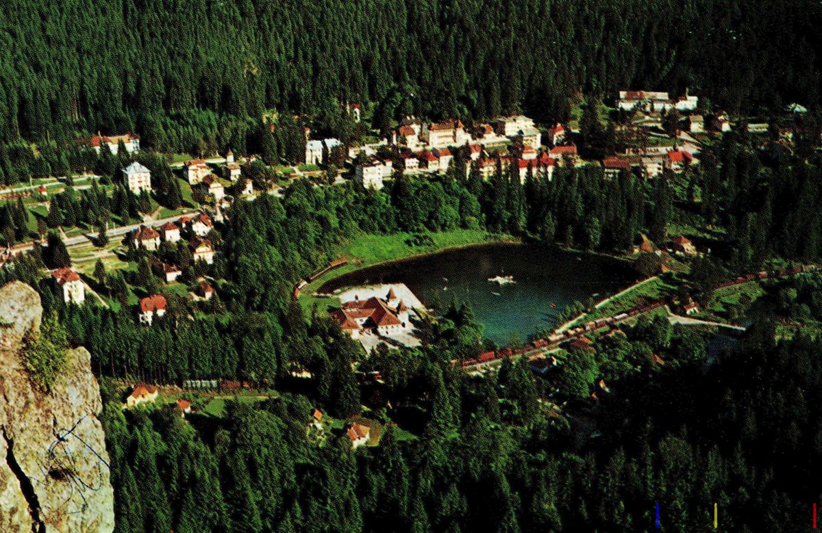 Imaginea prezintă o panoramă a unui peisaj montan, cu o așezare pitorească situată într-o zonă împădurită. În centrul imaginii se află un lac mic, înconjurat de vegetație luxuriantă. Casele din apropiere sunt dispuse pe pantele dealurilor, cu acoperișuri roșii și grădini verzi. În fundal, se observă o pădure densă de conifere, care completează atmosfera naturală și liniștită a zonei. Culoarea verde a copacilor și albastrul apei creează un contrast plăcut, sugerând un loc ideal pentru relaxare și evadare în natură.