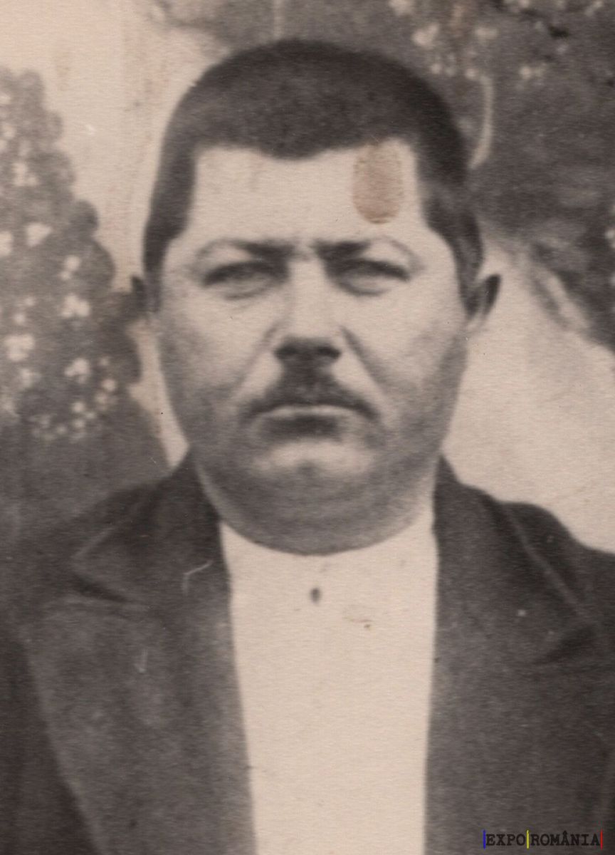 Imaginea este un portret alb-negru al unui bărbat cu o tunsoare scurtă și mustață. Poartă un sacou închis la culoare peste o cămașă deschisă, fără cravată. Fundalul este neclar, dar pare să includă elemente naturale sau vegetale. Pe fruntea bărbatului este vizibilă o pată sau o deteriorare a fotografiei. Expresia facială a bărbatului este serioasă.