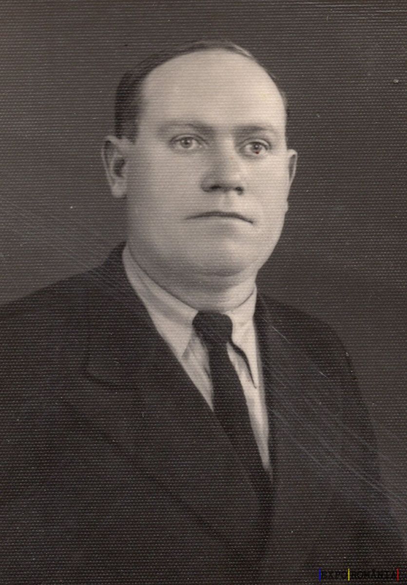 Imaginea prezintă un portret alb-negru al unui bărbat. Bărbatul poartă o cămașă cu guler și cravată, iar peste aceasta un sacou. Are părul tuns scurt și un aspect serios pe față. Fundalul este simplu, de culoare uniformă, fără elemente distinctive. Poza este realizată în stilul caracteristic fotografiilor de studio din secolul trecut.