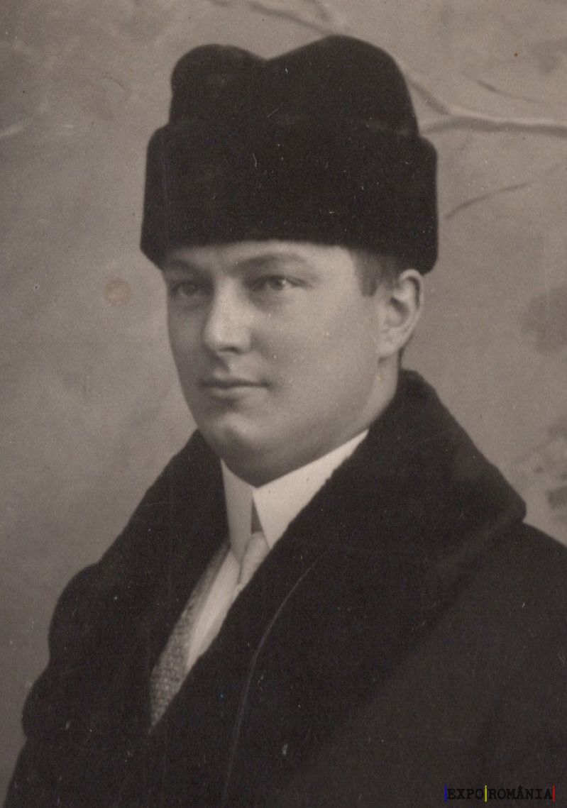 În imagine se află un bărbat tânăr, îmbrăcat într-un palton elegant și purtând o căciulă de blană. Fotografia are un aspect alb-negru, sugerând că a fost realizată într-o perioadă mai veche. Bărbatul privește direct către cameră, având o expresie serioasă și calmă. Fundalul este simplu, cu o textură subtilă, care nu distrage atenția de la subiect.