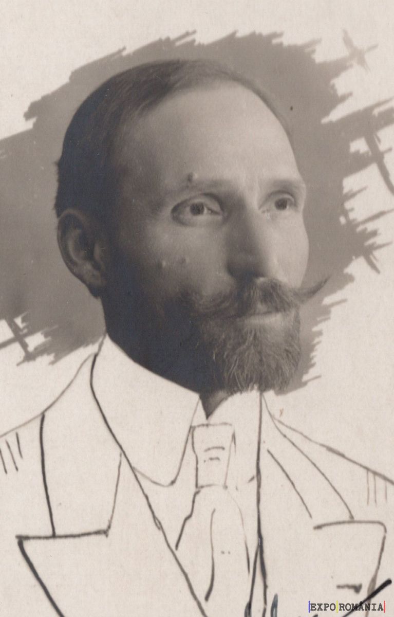 Fotografia prezintă un portret alb-negru al unui bărbat. Bărbatul are părul scurt și o mustață proeminentă, iar barba sa este bine întreținută. Poartă un sacou și o cravată, iar desenele cu linii negre pe costumul său accentuează detaliile ținutei. Fundalul este simplu, ilustrat cu o umbră artistică care înconjoară capul bărbatului. Imaginea pare a fi una veche, probabil datând din primele decenii ale secolului al XX-lea.