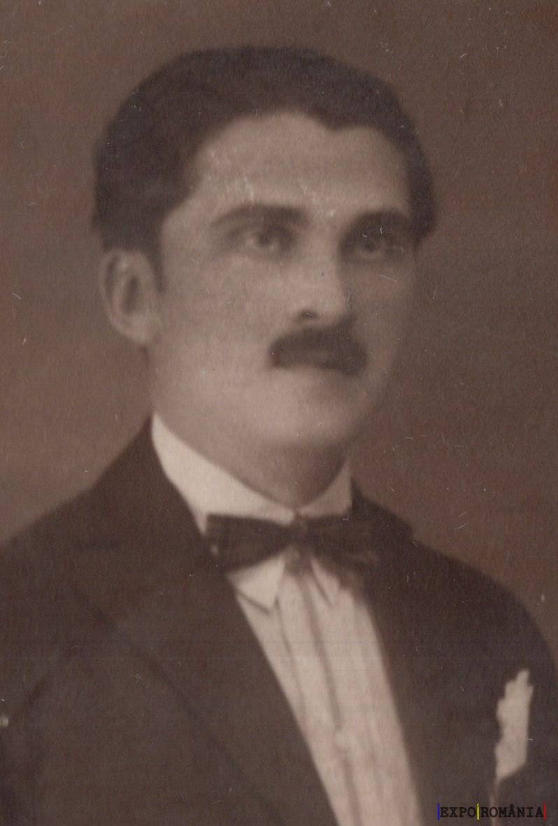 Fotografia prezintă un bărbat tânăr, îmbrăcat elegant. Poartă un costum la care asortează un papion și o cămașă albă. Bărbatul are părul de culoare închisă, tuns scurt, și o mustață distinctă. Imaginea pare să fie una de epocă, având o notă vintage. Fundalul este simplu și neornamentat, punând accentul pe subiectul principal al fotografiei.