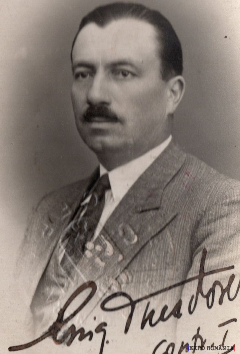 Imaginea prezintă un bărbat cu mustață, îmbrăcat într-un costum formal, vestonul său având o textură fină și dungată. Poartă o cravată cu un model complex și o cămașă albă pe dedesubt. Fotografia este alb-negru și are un aspect vintage. În colțul din dreapta jos al imaginii este un autograf, iar numele semnatarului începe cu „Emig. Theodor” și urmează alte cuvinte mai puțin clare.