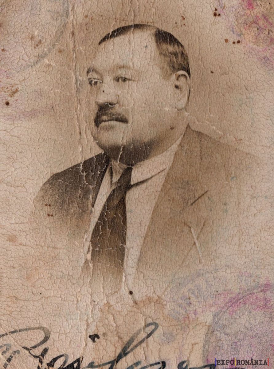 Imaginea prezintă o fotografie veche, în sepia, a unui bărbat cu păr scurt și mustață. El poartă un costum clasic, cu sacou și cravată. Fotografia este deteriorată, având urme de crăpături și pete vizibile. În partea de jos a imaginii se poate observa o semnătură sau o scriere de mână. Fundalul este simplu și neutru, lăsând figura bărbatului să fie punctul central al imaginii.