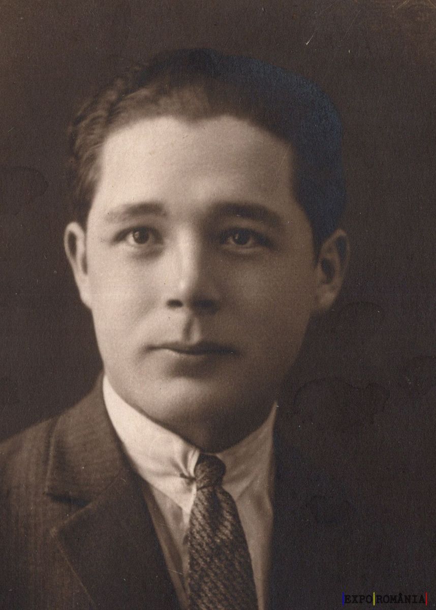 În imagine este portretul unui bărbat tânăr, îmbrăcat elegant. Poartă o cămașă albă și un sacou de costum închis la culoare, asortat cu o cravată. Are părul scurt și bine aranjat. Fundalul este simplu și întunecat, scoțând în evidență trăsăturile faciale ale bărbatului. Imaginea pare a fi alb-negru sau sepie, sugerând că ar putea fi veche.