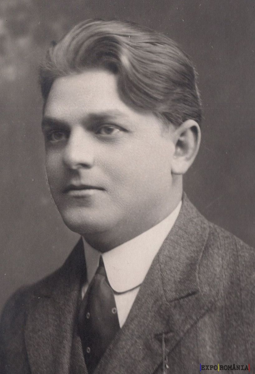 În imagine este un portret alb-negru al unui bărbat tânăr. Poartă un costum clasic, cu o cămașă albă și cravată, iar sacoul are un aspect elegant, specific începutului de secol XX. Bărbatul are părul des și bine aranjat, ușor pieptănat într-o parte. Privirea sa este îndreptată într-o parte, iar expresia sa este calmă și serioasă. Fundalul este simplu și neclar, punând în evidență figura centrală.