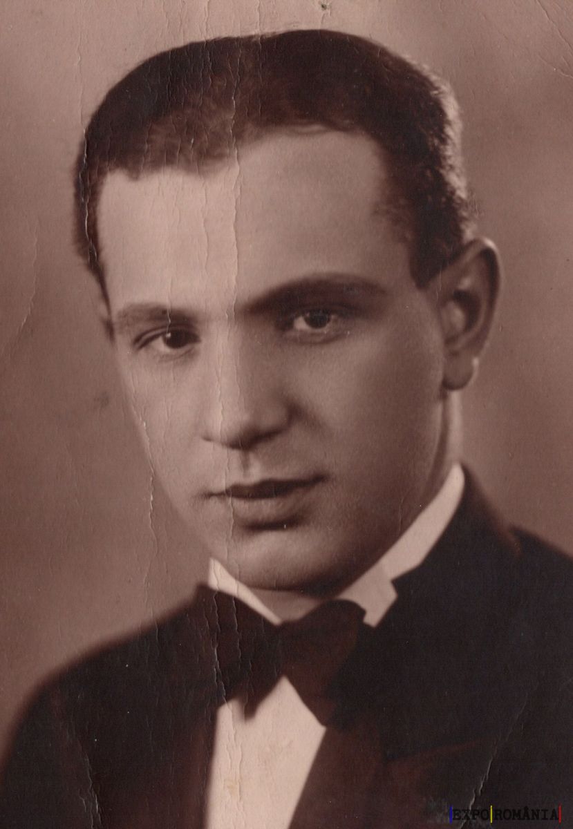 Imaginea prezintă un portret alb-negru al unui bărbat tânăr. Bărbatul poartă un costum formal, completat cu papion. Expresia sa facială este serioasă și privirea este direcționată ușor în jos, către cameră. Fotografia pare să fie ceva mai veche, având semne de uzură sau zgârieturi pe suprafață. Fundalul este sfumat și neutru, adăugând un aspect clasic portretului.