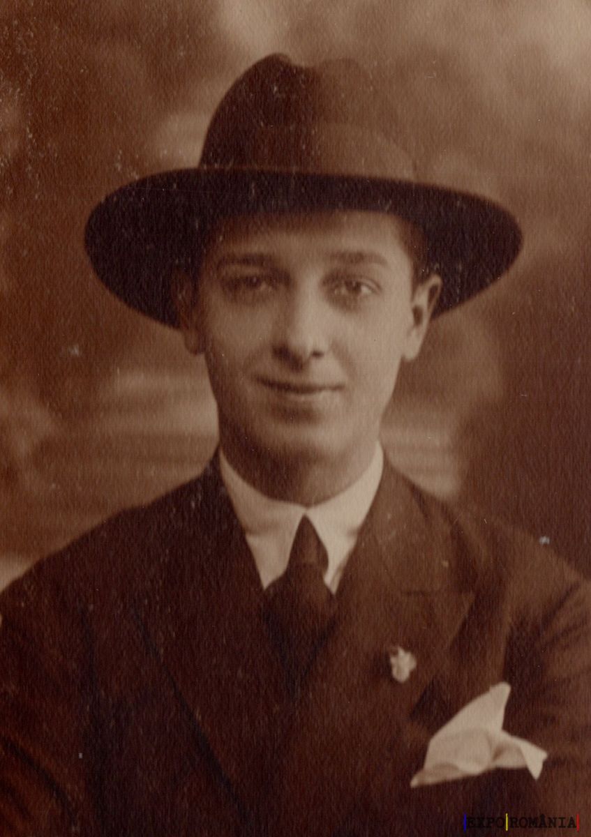 Imaginea prezintă un portret vechi, de tip sepia, al unui bărbat tânăr. El poartă un costum elegant, compus dintr-un sacou și o cravată, și are un pălărie cu boruri largi pe cap. Bărbatul are o expresie calmă și un mic zâmbet pe față. În buzunarul sacoului, se poate observa o batistă albă. Fundalul este neclar, punând în evidență figura centrală. Fotografia evocă o atmosferă din primele decenii ale secolului XX.