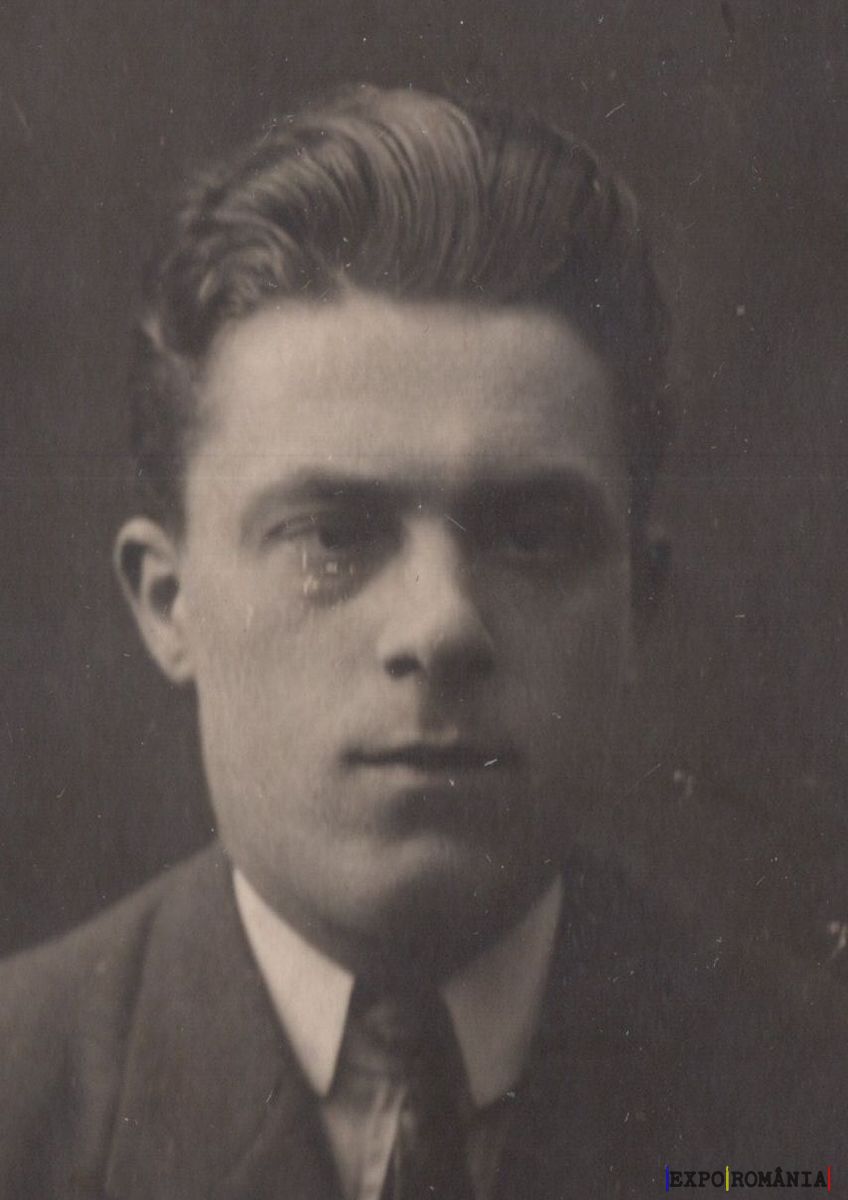 Imaginea prezintă un portret alb-negru al unui bărbat tânăr. El are părul aranjat și poartă un costum elegant, cu sacou și cămașă albă. Expresia feței lui este serioasă. Fundalul este simplu și întunecat, fără detalii vizibile. Fotografia pare să fie făcută într-un studio fotografic.
