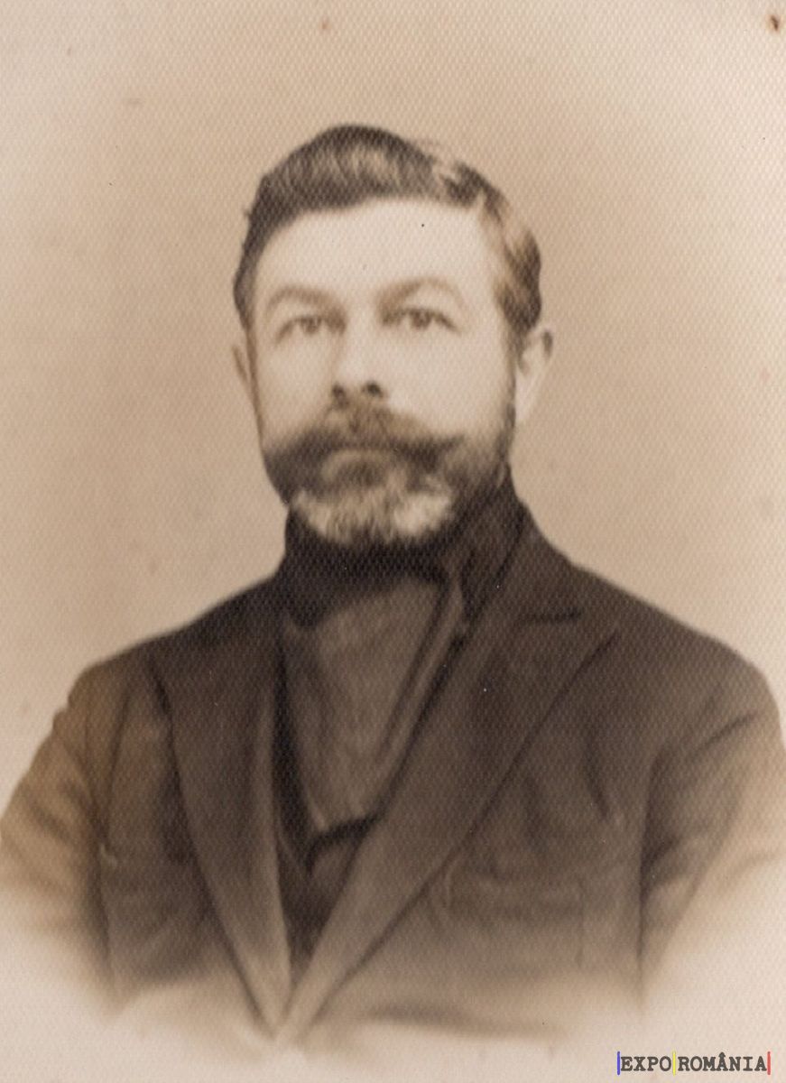 Fotografia prezintă un bărbat cu păr scurt și mustață bogată, care poartă un costum de epocă. Persoana din imagine poartă o jachetă de culoare închisă și o cămașă cu guler înalt. Fundalul este simplu, fără detalii vizibile, centrând atenția asupra subiectului principal. Imaginea are un aspect vintage, sugerând că ar fi fost realizată cu mult timp în urmă.