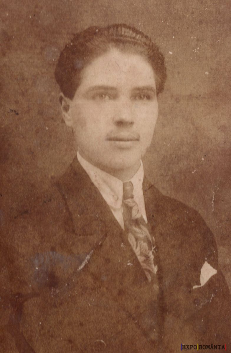 Imaginea prezintă un portret vechi, fotografic, al unui bărbat tânăr. Bărbatul poartă un costum formal, inclusiv o cravată decorativă și o cămașă albă cu guler înalt. El are părul aranjat cu grijă, aparent dat pe spate. Fotografia este monocromă și prezintă semnele specifice ale vechimii și uzurii, cum ar fi pete și decolorări. Fundalul este simplu, fără detalii evidente care să distragă atenția de la subiectul principal.