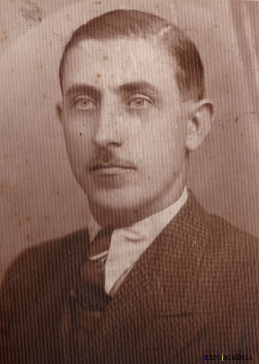 Imaginea prezintă un portret alb-negru al unui bărbat tânăr. Acesta are părul scurt și pieptănat înspre spate, o mustață subțire și se uită ușor în lateral. Poartă un sacou în carouri asortat cu o cămașă albă și o cravată închisă la culoare. Fundalul imaginii este simplu și uniform, fără detalii, scoțând astfel în evidență trăsăturile și îmbrăcămintea bărbatului. Fotografia, probabil realizată în prima jumătate a secolului XX, are semne de uzură și mici pete de suprafață, sugerând vechimea sa.