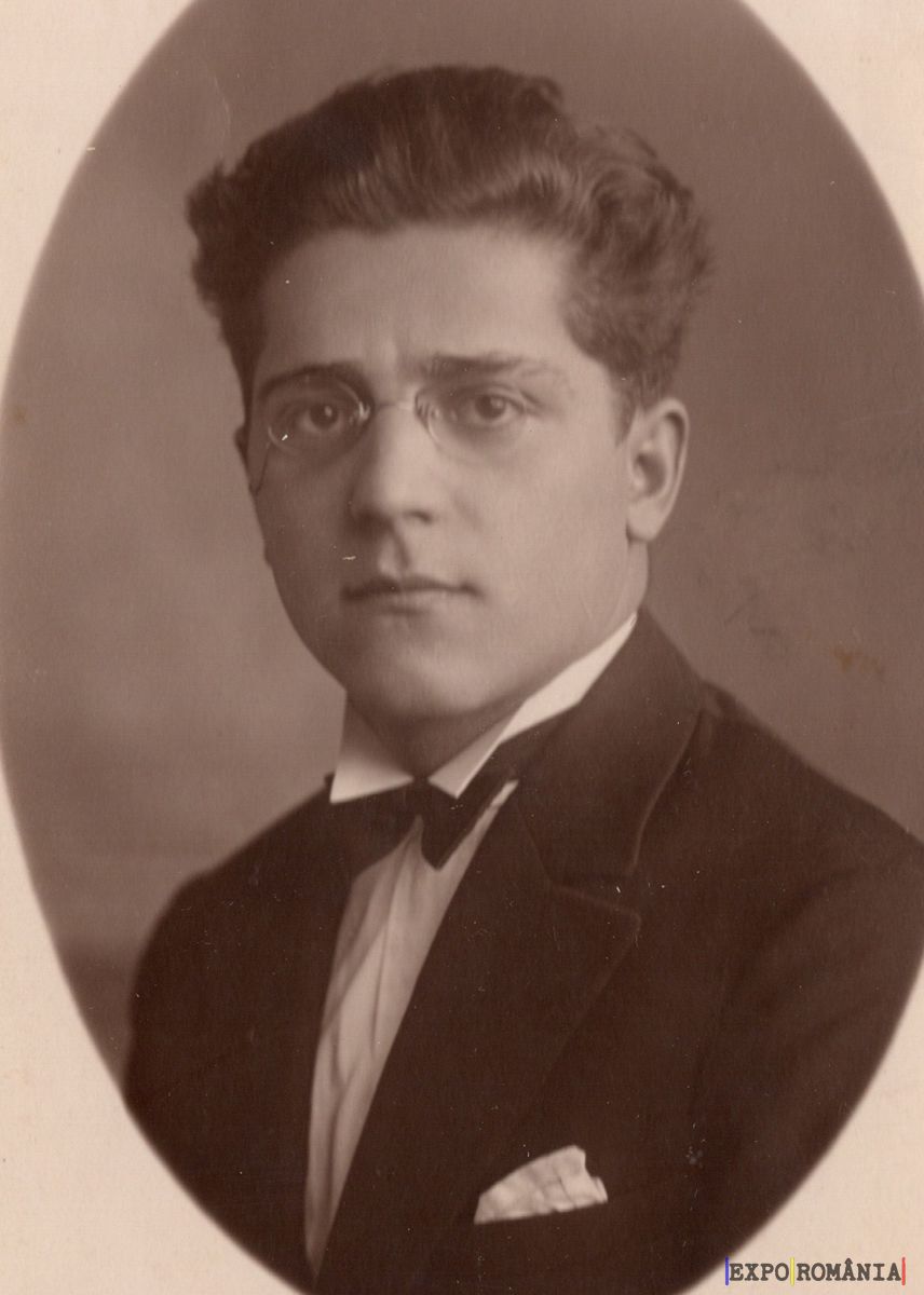 Imaginea prezintă un portret alb-negru al unui bărbat tânăr care poartă ochelari. Bărbatul are părul închis la culoare, coafat atent și voluminos. El poartă un costum negru, cu o cămașă albă și papion. De asemenea, se observă un batistă albă ieșind din buzunarul de la piept al sacoului. Fundalul este simplu, neutru, ceea ce pune accent pe figura și vestimentația bărbatului. Fotografia pare să fie realizată în stilul portretelor formale din prima parte a secolului XX.