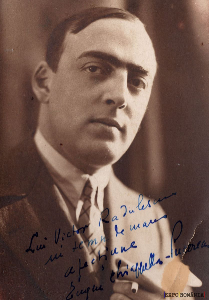 Imaginea prezintă un portret vechi, sepia, al unui bărbat. Este îmbrăcat în costum, cu cravată, și ține ceva în mână, iar expresia sa este serioasă. Pe imagine, se află un mesaj scris de mână, dedicat lui Victor Radiulian. Mesajul pare a fi semnat de o persoană al cărei nume este Eugen Cristea.
