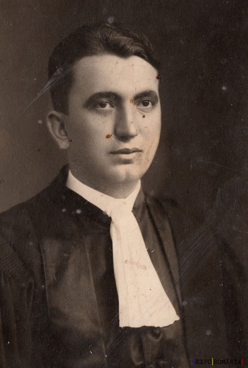 Aceasta este o fotografie în sepia a unui bărbat tânăr. Bărbatul poartă o robă neagră formală și o cravată albă specifică profesiei de avocat sau judecător. Are părul scurt și tras înapoi, și privește drept înainte cu o expresie serioasă. Fundalul imaginii este simplu și întunecat, fără elemente decorative. Fotografia pare să fie una veche, având în vedere stilul și tonalitățile folosite.