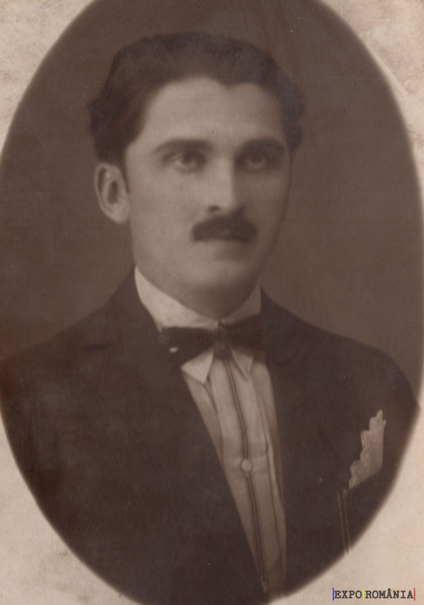 Fotografia prezintă un bărbat tânăr, probabil dintr-o perioadă mai veche, având în vedere stilul fotografiei și moda. Poartă un costum elegant, cu sacou și cămașă, accesorizate cu un papion. Bărbatul are părul scurt, aranjat și un mustață bine îngrijită. Imaginea este monocromatică și pare să fie realizată în sepia, un stil popular în fotografie la începutul secolului XX. Fundalul este simplu și focalizarea este pe subiectul principal.