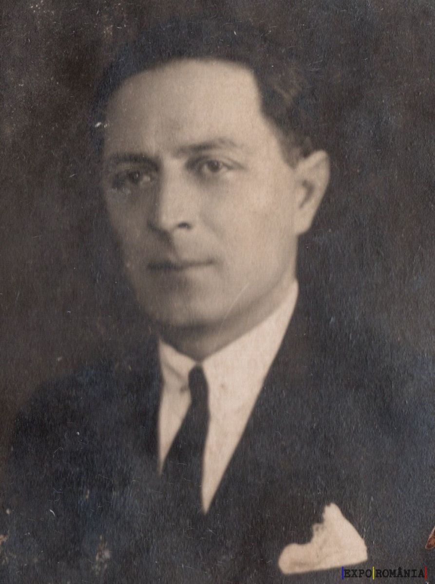 În imagine este un portret vechi alb-negru al unui bărbat îmbrăcat elegant. Acesta poartă un sacou închis la culoare, cămașă albă și cravată. Fața sa este serioasă și privește direct către cameră. În buzunarul sacoului, bărbatul are un batist alb. Imaginea are un aspect vechi, cu semne de uzură, ce sugerează că a fost realizată cu mulți ani în urmă.