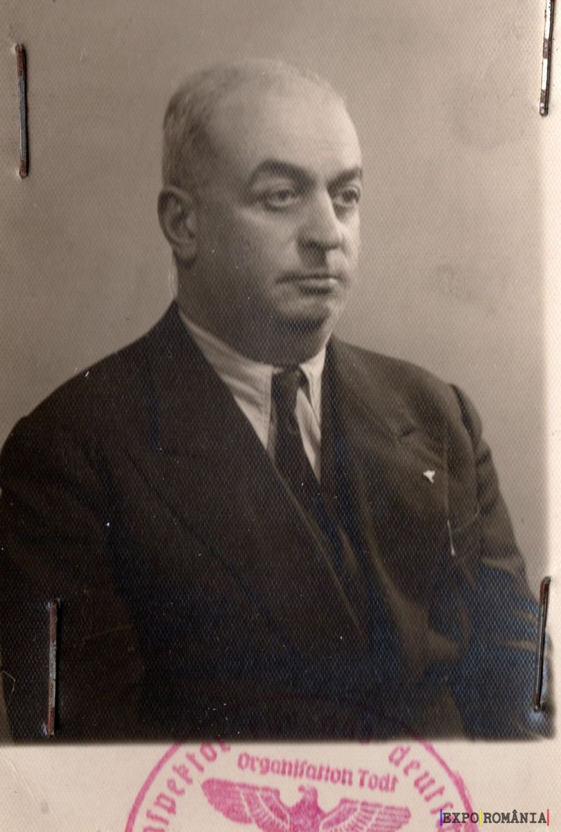 Imaginea prezintă o fotografie în alb-negru a unui bărbat cu părul scurt și deschis la culoare, îmbrăcat într-un costum și cravată. Fotografia este atașată într-un document, având patru capse în colțuri. Se poate observa parțial un timbru roz cu inscripții și un simbol, plasat în partea inferioară a imaginii. Bărbatul are o expresie serioasă, iar fundalul este simplu și neornamentat.