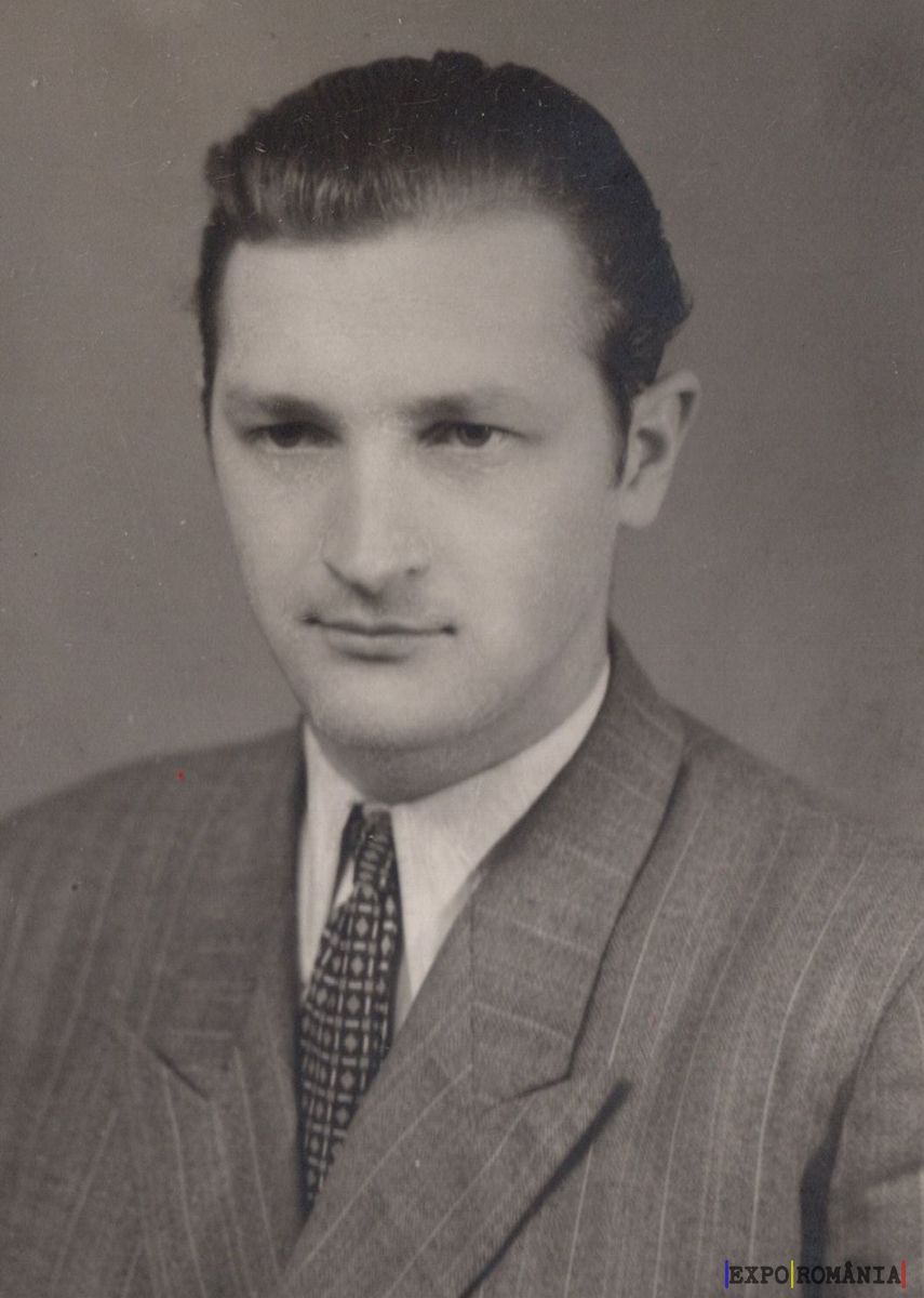Imaginea prezintă un bărbat tânăr, îmbrăcat elegant într-un costum cu dungi subțiri. El poartă o cămașă albă și o cravată cu model. Părul îi este pieptănat și dat pe spate, iar expresia feței este serioasă. Fotografia este de tip alb-negru și pare a fi una de epocă, subliniind un stil clasic și formal. Fundalul este simplu și neutru, punând accentul pe trăsăturile persoanei fotografiate.