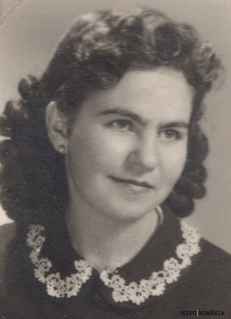 În imagine este o fotografie alb-negru a unei femei tinere. Ea are părul ondulat și poartă o bluză sau o rochie închisă la culoare, cu un guler decorat cu un model de dantelă albă. Expresia feței este calmă și ușor zâmbitoare. Fundalul este simplu și lipsit de detalii.