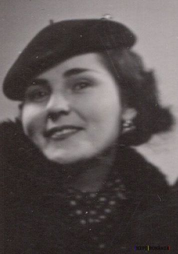 Imaginea prezintă o femeie zâmbitoare, purtând un beret negru și o haină de blană. Părul este aranjat într-un mod elegant, iar cu accesoriile sale, cum ar fi cerceii, contribuie la un stil sofisticat. Fundalul este neclar, atribuind un aer de mister și focalizând atenția asupra chipului și expresiei feminine. Fotografia pare a fi alb-negru, sugerând o perioada mai veche.