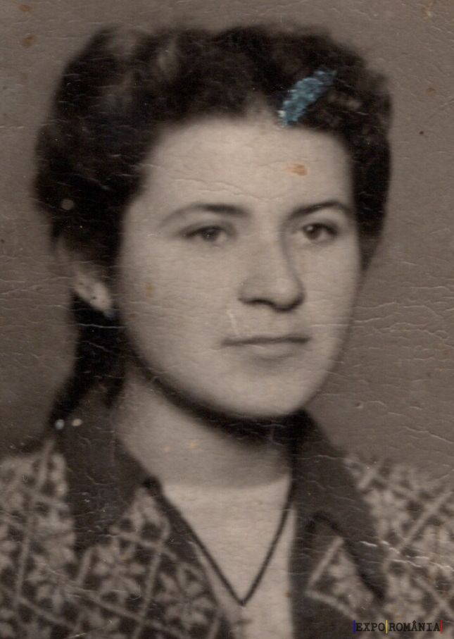 Aceasta este o fotografie vintage în sepia a unei femei tinere. Ea are părul scurt și ondulat, aranjat în stilul anilor ’50-’60. Poartă o cămașă cu un model geometric, descheiată la gât, iar pe dedesubtul cămășii se observă un lănțișor cu un pandantiv. Fundalul este simplu și necardat, punând accentul pe portretul femeii.