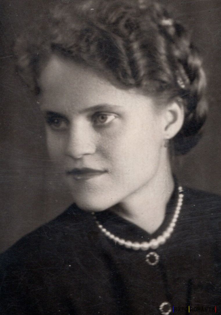 Imaginea prezintă o femeie tânără, surprinsă într-o fotografie de epocă. Ea poartă o rochie sau un top simplu și elegant, accesorizat cu un colier de perle care se remarcă la gâtul său. Părul său este coafat într-un mod elaborat, cu bucle fine și un coc la spate. Femeia are o expresie serioasă și privirea sa este orientată ușor lateral. Fundalul fotografiei este simplu, fără detalii specifice, punându-se astfel accent pe portretul acesteia. Fotografia are un aspect clasic, probabil realizată în prima jumătate a secolului XX.
