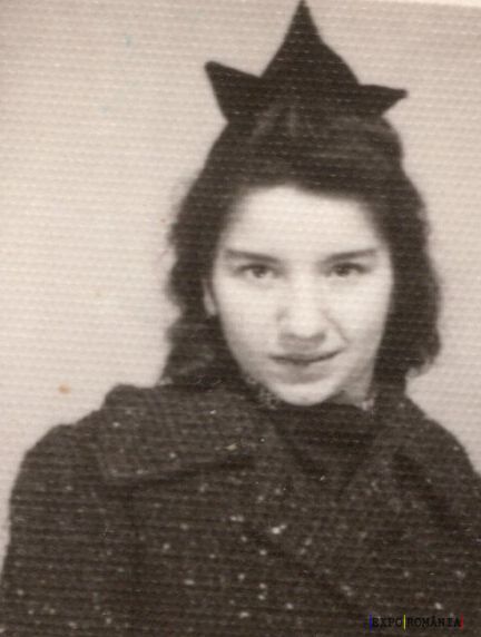 Imaginea prezintă o tânără femeie cu părul negru ondulat, purtând un accesoriu de păr în formă de fundă neagră. Ea poartă un palton sau un sacou de culoare închisă, care pare să fie dintr-o textură groasă și ușor pătată. Femeia are o expresie serioasă și privirea îndreptată direct către aparat. Fotografia pare să fie veche, având un aspect ușor granulat.