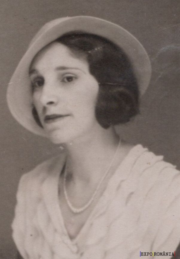 Imaginea prezintă o femeie purtând o pălărie elegantă, ușor înclinată pe o parte, cu părul scurt și ondulat. Aceasta poartă o bluză cu volane și un colier de perle la gât. Stilul fotografiei și modul în care este îmbrăcată sugerează că imaginea ar putea fi din prima jumătate a secolului XX. Fotografiată într-un mod clasic, imaginea emană un aer de eleganță și rafinament.