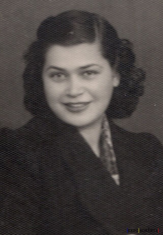 Fotografia prezintă o femeie tânără cu părul creț, coafat în bucle, îmbrăcată într-un palton închis la culoare. Ea zâmbește ușor și privirea sa este îndreptată direct către aparatul de fotografiat. Imaginea este una alb-negru, sugerând că este posibil să fie realizată acum câteva decenii, având un aspect clasic și elegant specific perioadelor trecute. Fundalul este neutru, astfel încât atenția este concentrată în întregime asupra subiectului fotografiei.