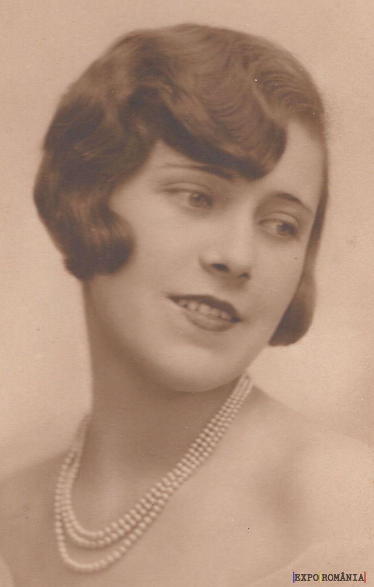 Imaginea prezintă o femeie tânără, cu părul tuns scurt, ondulat și aranjat, într-un stil specific anilor 1920-1930. Ea poartă un colier cu două rânduri de perle și privește într-o parte, zâmbind ușor. Fotografia are o nuanță sepia, specifică fotografiilor vechi, conferindu-i un aer nostalgic și elegant. Fundalul este simplu, punând în evidență trăsăturile delicate ale femeii.