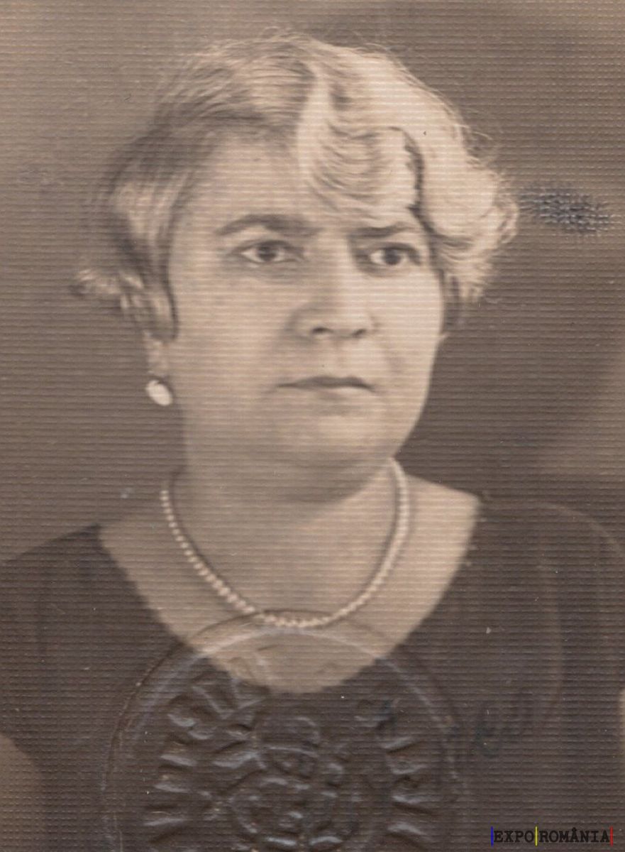 Imaginea prezintă un portret alb-negru al unei femei. Aceasta are părul scurt, ondulat și deschis la culoare, stilizat într-o manieră tipică a anilor 1920-1930. Poartă cercei simpli și un colier de perle la gât. Femeia are o expresie serioasă și este îmbrăcată într-o bluză închisă la culoare. Fundalul este simplu, fără detalii vizibile care să distragă atenția de la portretul propriu-zis.