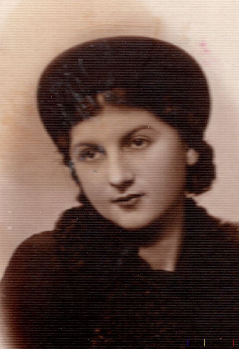 Imaginea este un portret alb-negru al unei femei tinere. Aceasta poartă un coif sau o pălărie pe cap și are părul ondulat. Este îmbrăcată într-un costum care pare a fi gros, potrivit pentru vreme rece. Femeia are o expresie calmă și neutră pe față, iar fundalul este simplu, fără detalii notabile. Fotografia pare a fi veche, datând probabil din prima jumătate a secolului 20, având în vedere stilul vestimentar și calitatea imaginii.
