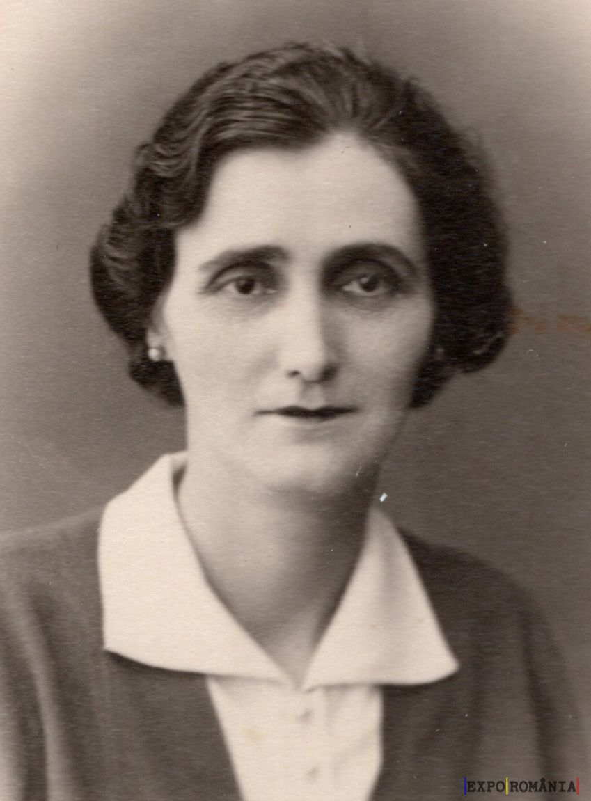 Imaginea prezintă o femeie cu părul brun, aranjat în bucle scurte, având un aspect clasic. Ea poartă o cămașă albă cu guler și un sacou sau pulover cu guler de culoare deschisă. Expresia sa facială este serioasă și privirea calmă este îndreptată direct spre cameră. Fotografia are un aspect vintage, fiind realizată în alb-negru, sugerând că provine dintr-o perioadă mai veche.
