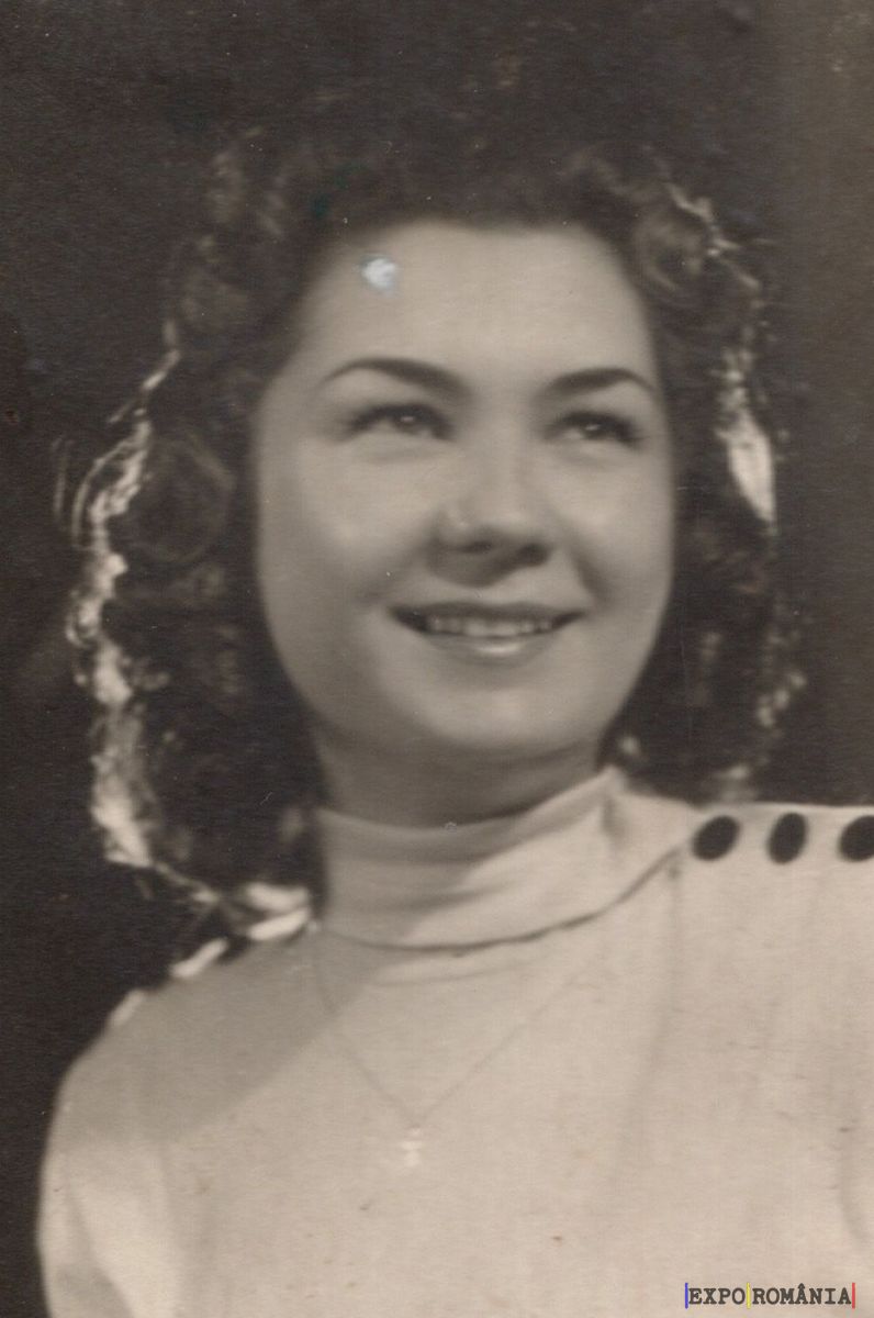 Imaginea prezintă o femeie zâmbitoare, cu părul ondulat, purtând o bluză deschisă la culoare cu guler înalt și nasturi decorativi pe umăr. Fundalul este întunecat. Este o fotografie în alb-negru, probabil veche, având un aer nostalgic.