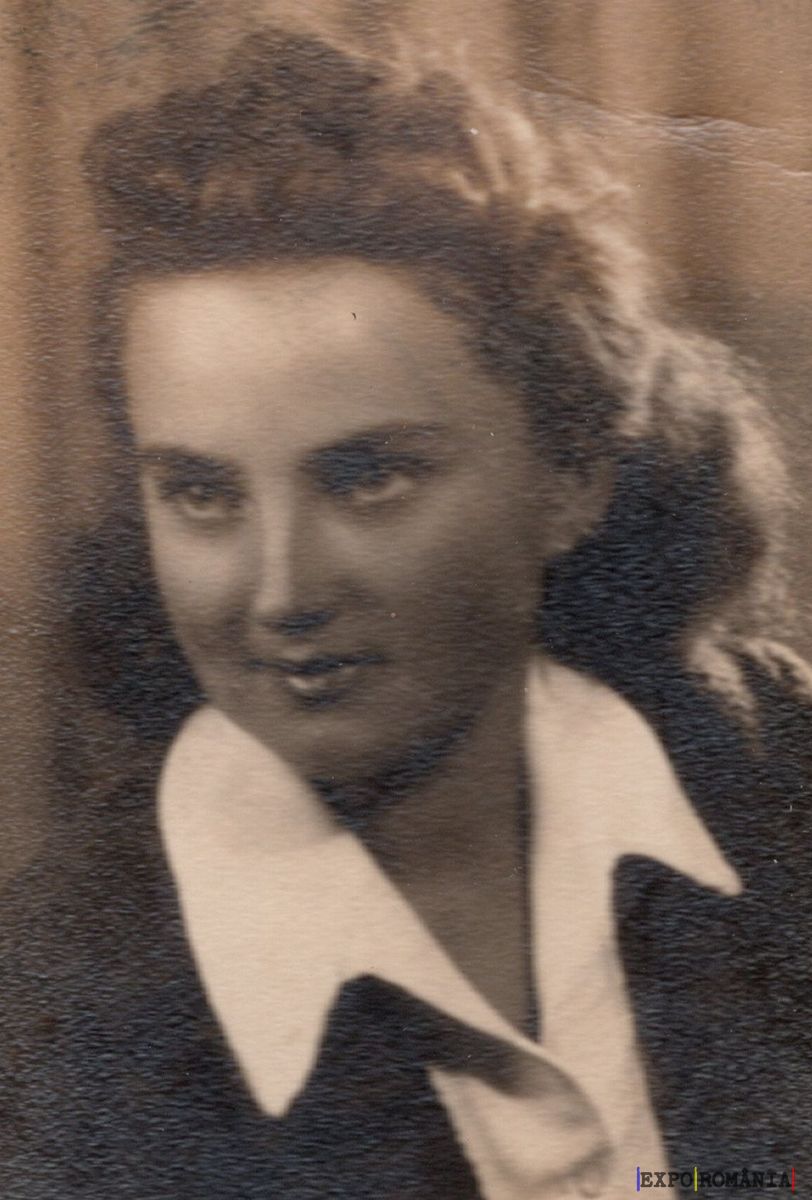 Fotografia prezintă o femeie cu părul lung și ondulat, aranjat într-o coafură voluminoasă. Ea poartă o bluză albă cu guler larg și o haină deschisă la culoare. Imaginea este sepia și are un aspect vintage, sugerând că a fost făcută în urmă cu câteva decenii. Expresia feței femeii este zâmbitoare și privirea ei este îndreptată ușor într-o parte. Fundalul este neclar, punând accentul pe persoana din prim-plan.
