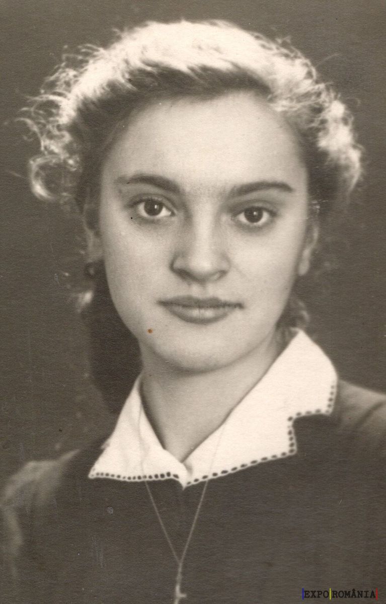 Imaginea prezintă un portret alb-negru al unei femei tinere. Aceasta are părul închis la culoare, pieptănat într-un mod simplu, cu bucle lejere spre spate. Poartă un top închis la culoare cu un guler alb, decorat cu detalii brodate pe margini. De la gât îi atârnă un lănțișor subțire cu un pandantiv mic. Expresia feței sale este serioasă și privirea ei este îndreptată direct către obiectivul camerei. Fundalul din spatele femeii este simplu și uni, fără detalii.