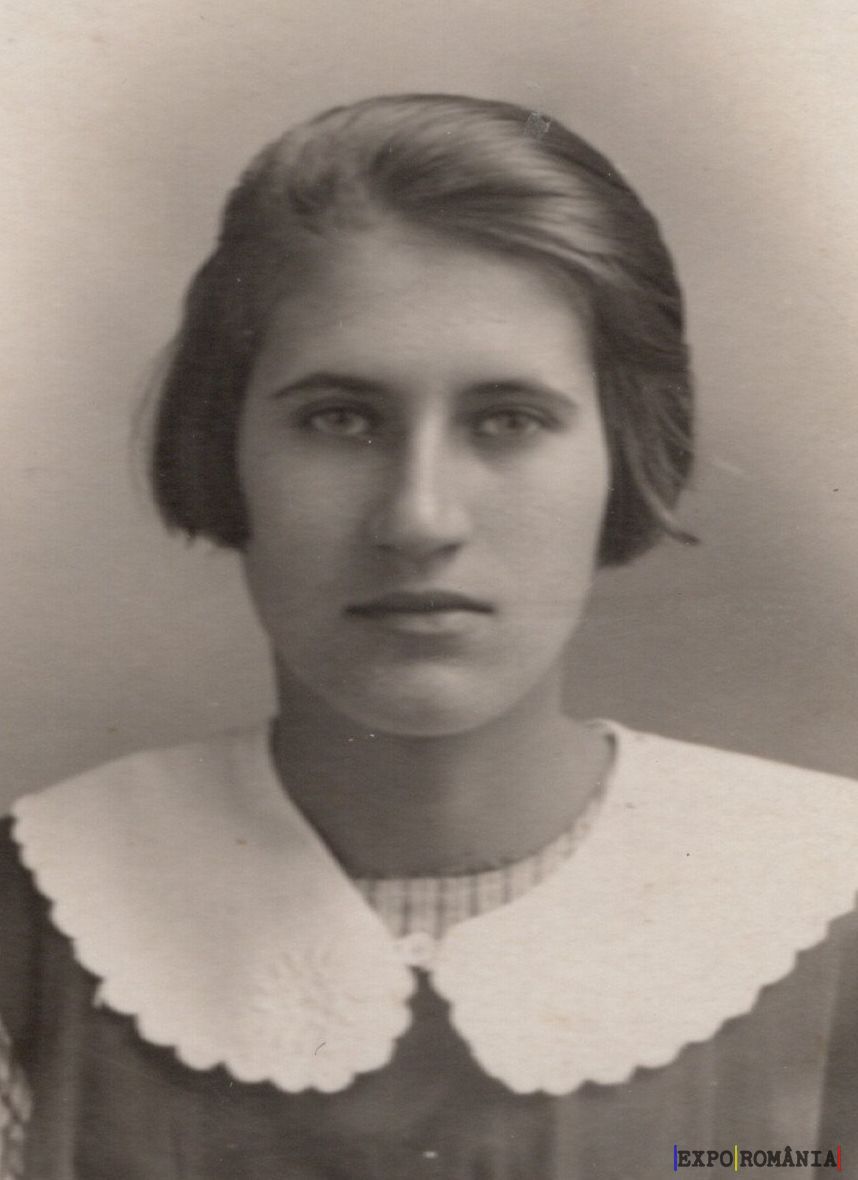 În imagine este portretul unei femei tinere, fotografiată alb-negru. Ea are părul scurt, pieptănat într-o parte, și poartă o bluză cu guler alb decorat cu modele delicate. Privirea ei este îndreptată direct spre cameră și are o expresie serioasă. Fundalul fotografiei este simplu, fără elemente decorative, punând în evidență trăsăturile persoanei fotografiate.
